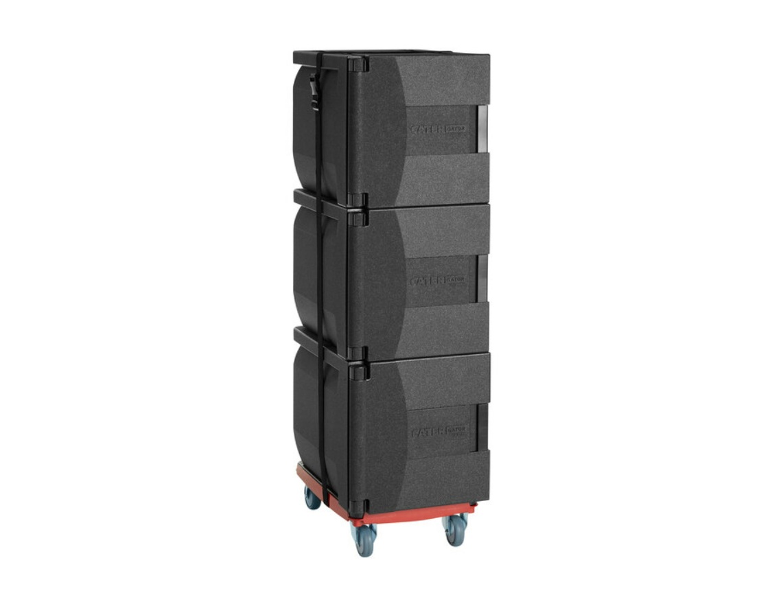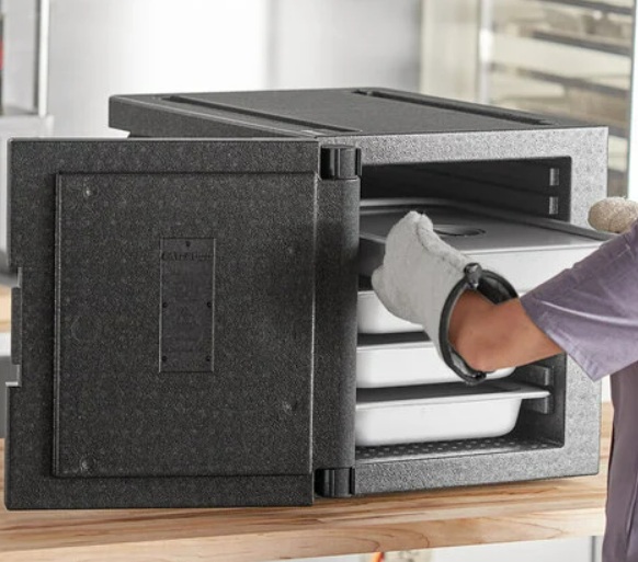 Professional grade thermal insulated food pan carrier with latching front load door. Each unit fits up to 5 full size, 2 1/2" deep food pans (not included). Maintains hot or cold temperatures for up to 4 hours.