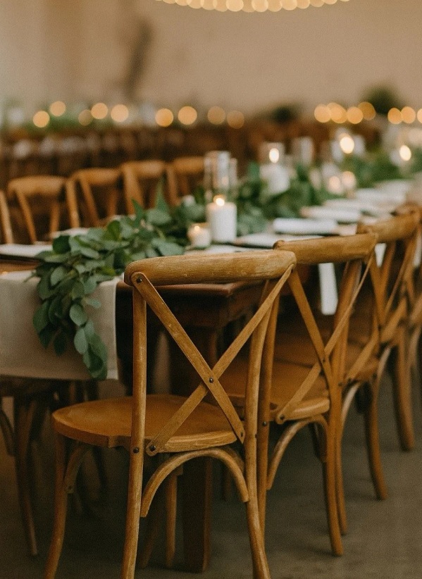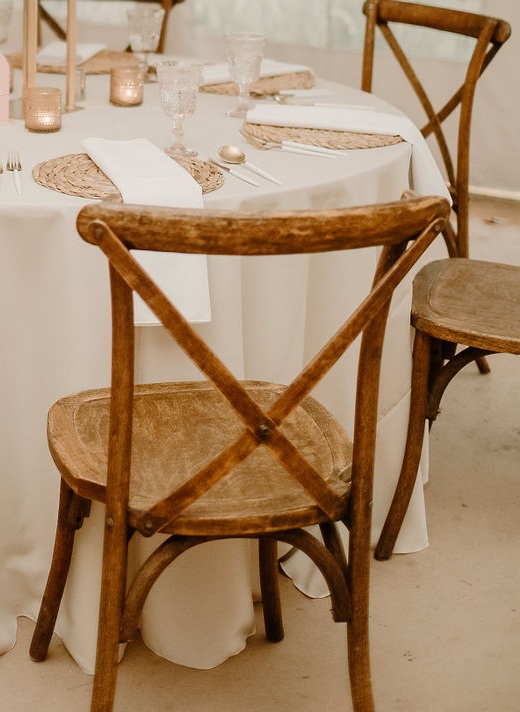 Our cross back chairs are a rustic style X-Back chair in a wood grain finish - reminiscent of a vineyard estate. The sturdy non-folding design of these chairs provide the comfort and stability of a traditional dinning chair. They're a popular rental chair for vintage farmhouse or Boho themed wedding ceremonies and receptions.