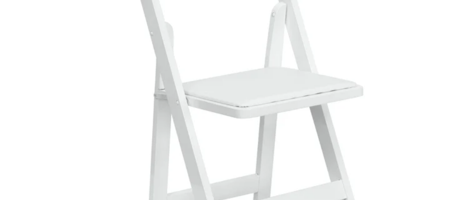 Our garden chairs are the most popular rental chair for outdoor wedding ceremonies and receptions. These folding chairs feature a wide wood/resin* frame and arched back in a white finish for a traditional look and feel. The sturdy design and one inch thick foam vinyl padding make these chairs a great seating option for any occasion.